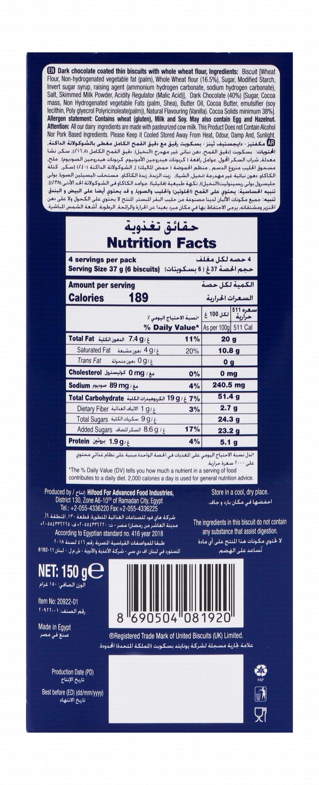 McVitie’s Digestive Thins Dark Chocolate Coated Biscuits – trans fat free, artificial colors, artificial flavors free